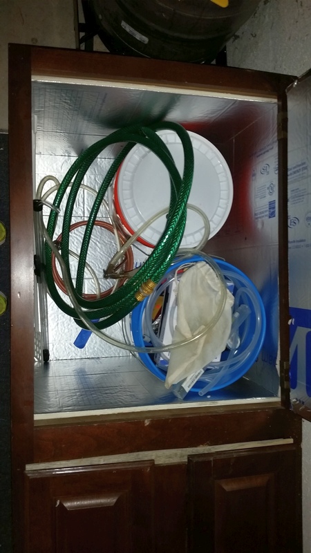 I didn't take any pictures beyond the mash step because, while it boiled, I was busy building the temperature controller part of my fermentation box. I took the old kitchen pantry which had been in the garage for years and I laid it on its back in the basement. Then, I lined the inside with John's Manville foil covered insulation board. A light-bulb inside a paint can serves as the heat source. I haven't decided on a cooling method, yet. I'm not sure I'll ever really need one since I keep the A/C on in the summer. Here's the final product...